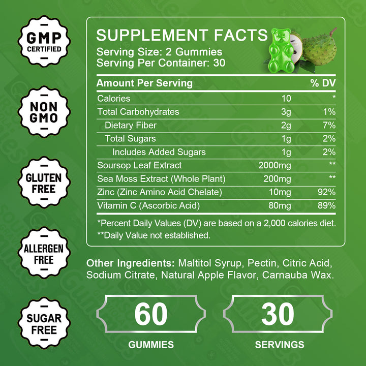 We prioritize promoting a healthy lifestyle. Unlike traditional maltose and xylitol, our fructose flavor comes from natural fructooligosaccharides - a prebiotic, rich in fiber that enhances immune system function and gut health. All of these make it a safer alternative to sugar for overall health. Say goodbye to hard-to-swallow soursop capsules and troublesome soursop leaf tea and try our easy-to-chew and delicious soursop gummies!