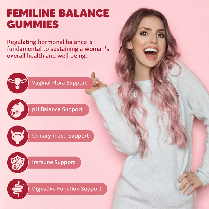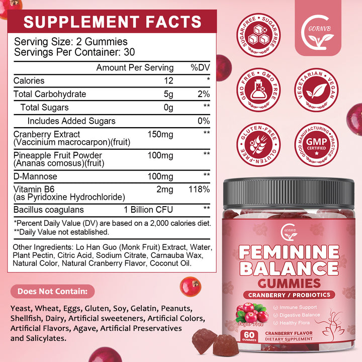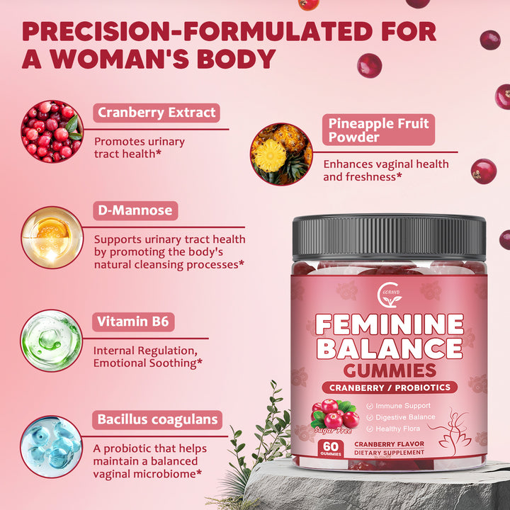 - Feminine Balance Gummies: With daily life pressures and a busy schedule, women's health is often overlooked, Our feminine probiotic gummies are specially formulated for women, featuring a unique blend of cranberry, pineapple fruit Powder, D-Mannose, Vitamin B6, Bacillus coagulans to improve comfort, odor, and pH balance, helping you stay fresh promote urinary tract comfort, and gut healthand confident wherever you go