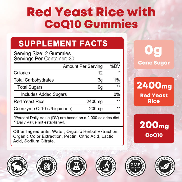 Our Red Yeast Rice 2400mg + CoQ10 200mg gummies blend two researched ingredients into one powerful supplement. Red Yeast Rice, a traditional ingredient, is paired with Coenzyme Q10, a naturally occurring antioxidant that helps maintain cardiovascular health and energy metabolism.